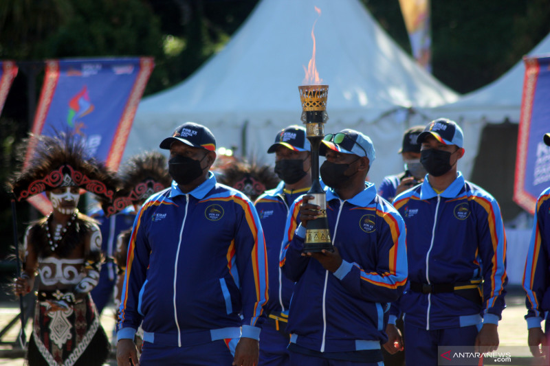 Mantan atlet Ortisan Solosa (kanan) dan Roni Wabia  membawa obor api abadi PON XX di kantor Bupati Sorong, Papua Barat, Senin (27/9/2021). Api Abadi PON XX yang telah diambil pada Sabtu (25/9/2021) di PLTMG Pertamina Klamono itu kemudian diserahterimakan dari pemerintah Provinsi Papua Barat kepada Panitia Besar PON XX untuk kemudian di kirab keliling Papua. ANTARA FOTO/Olha Mulalinda/pras.