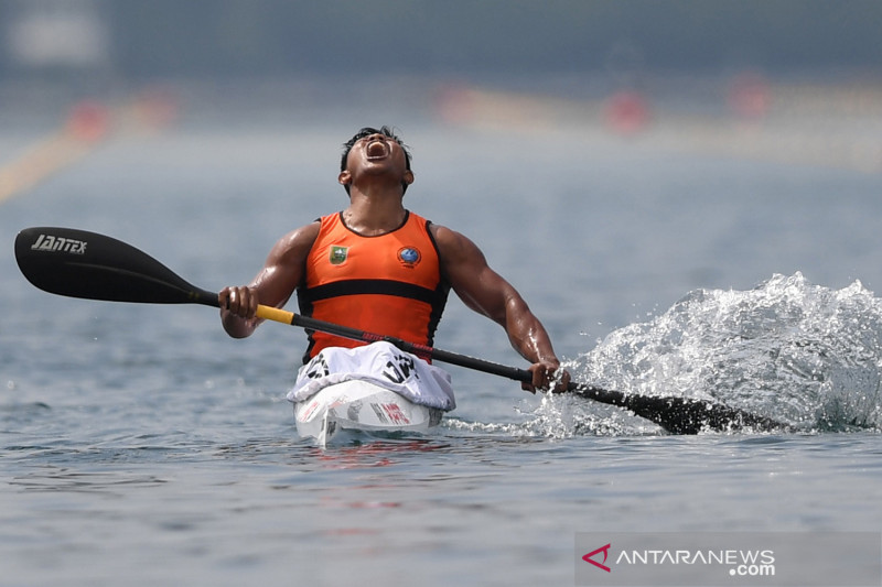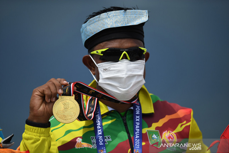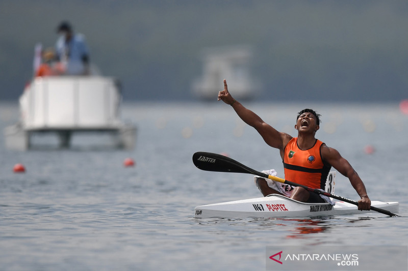 Pedayung Riau Maizir Riyondra meluapkan kegembiraannya usai memenangkan final canoeing MK1 1000 PON Papua di Teluk Youtefa, Papua, Selasa (28/9/2021). Maizir berhasil meraih emas, sementara perak direbut Joko Andriyanto asal Jambi dan perunggu diraih Angga Suwandi Putra asal Jakarta. ANTARA FOTO/Akbar Nugroho Gumay/aww.