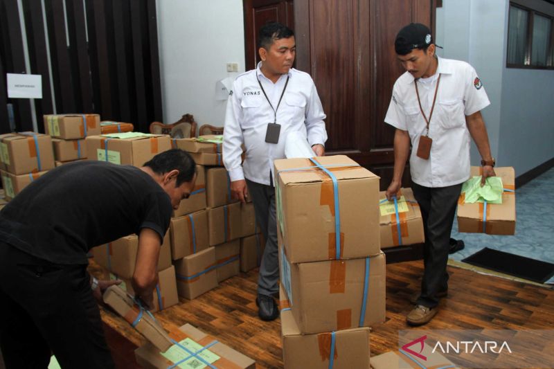 Petugas menata kotak kardus berisi surat suara Pemilu 2024 di Kantor KPU Provinsi Kalimantan Barat di Pontianak, Kalimantan Barat, Kamis (1/2/2024). KPU Provinsi Kalbar menerima 125.230 lembar surat suara Pemilihan Presiden dan Wakil Presiden (PPWP), Dewan Perwakilan Daerah, DPR RI, DPRD Provinsi, dan DPRD Kabupaten/Kota untuk mengganti surat suara yang rusak. ANTARA FOTO/Jessica Wuysang/aww.