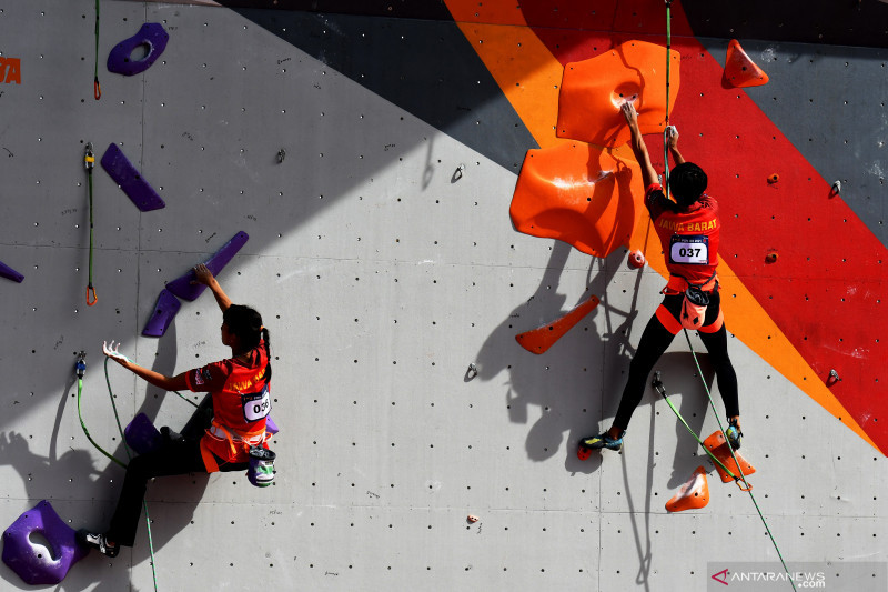 Atlet panjat tebing Jawa Timur Fitria Hartani (kanan) dan Kharisma Ragil Rakasiwi (kiri) beraksi pada final panjat tebing lead tim putri PON Papua di Arena Panjat Tebing SP 2, Kabupaten Mimika, Jumat (1/10/2021). Jawa Timur meraih medali emas dalam nomor lead tim putri, sementara medali perak diraih DKI Jakarta dan medali perunggu diraih Jawa Barat. ANTARA FOTO/Abriawan Abhe /tom.