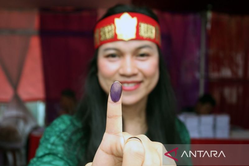 Warga menunjukkan jarinya yang telah dicelup tinta usai menggunakan hak pilihnya saat pemungutan suara susulan Pemilu 2024 di TPS 74 Pondok Maharta, Pondok Aren, Tangerang Selatan, Banten, Minggu (18/2/2024). Sebanyak 14 TPS di Tangerang Selatan melakukan pemungutan suara susulan karena terdampak banjir saat pelaksanaan pemilu serentak pada Rabu (14/2). ANTARA FOTO/Muhammad Iqbal/tom.