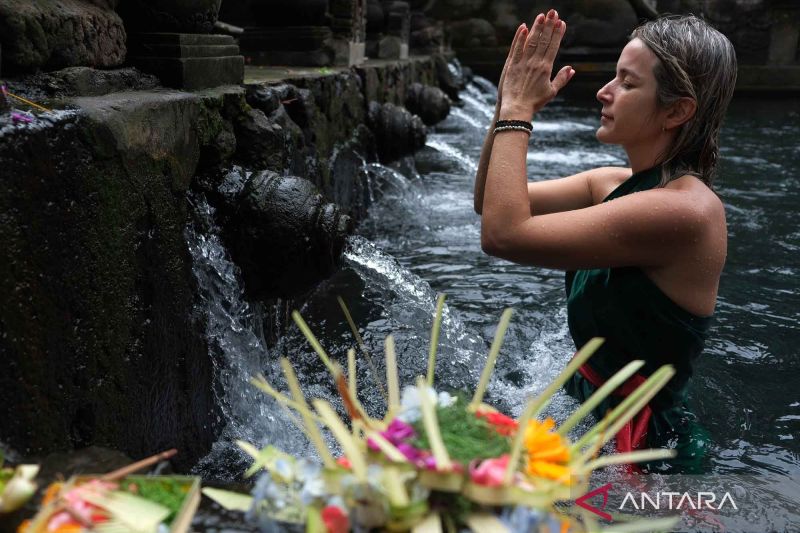 Sejumlah wisatawan mancanegara melakukan ritual melukat atau pembersihan diri di Pura Tirta Empul, Tampaksiring, Gianyar, Bali, Rabu (24/4/2024). Ritual tersebut direncanakan masuk dalam agenda World Water Forum (WWF) ke-10 di Bali yang akan diselenggarakan pada 18-25 Mei 2024 mendatang. ANTARA FOTO/Nyoman Hendra Wibowo/nym.