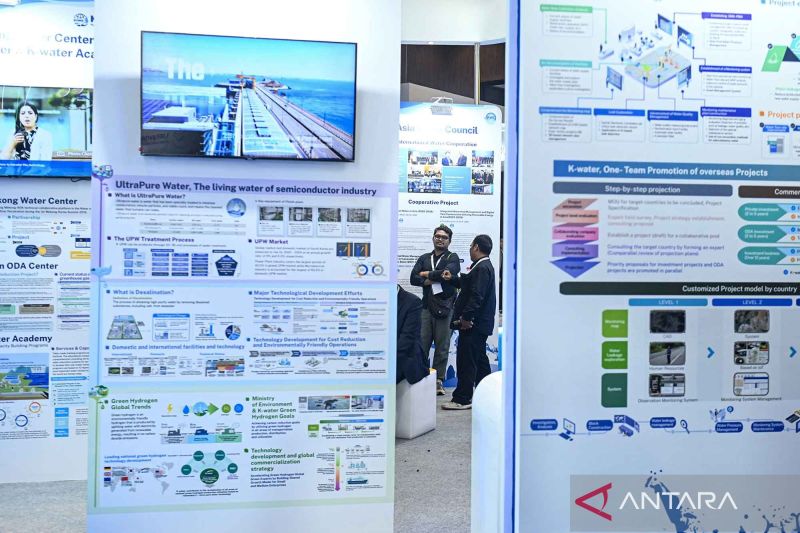 Delegasi melintas di depan stan pameran World Water Forum ke-10 di Bali Nusa Dua Convention Center, Nusa Dua, Badung, Bali, Senin (20/5/2024). ANTARA FOTO/Media Center World Water Forum 2024/Muhammad Adimaja/YU