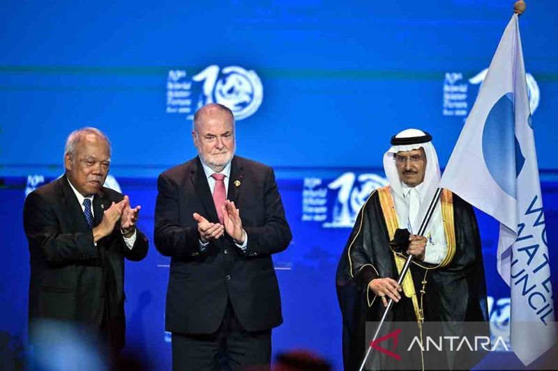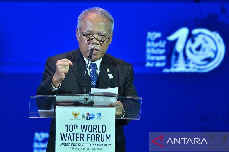 Presiden World Water Council Loic Fauchon (kanan) dan Menteri PUPR Basuki Hadimuljono (kiri) memberikan sambutan saat upacara penutupan World Water Forum ke-10 2024 di Nusa Dua, Badung, Bali, Jumat (24/5/2024). ANTARA FOTO/Media Center World Water Forum 2024/Bayu Pratama/pras.