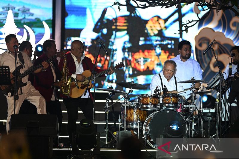 Menteri PUPR Basuki Hadimuljono bermain drum saat Malam Budaya (Cultural Night) World Water Forum ke-10 2024 di Taman Bhagawan, Nusa Dua, Badung, Bali, Jumat (24/5/2024). ANTARA FOTO/Media Center World Water Forum 2024/Fikri Yusuf/pras.