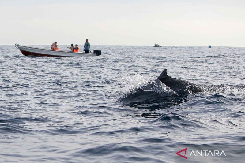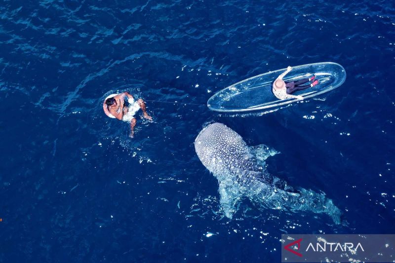 Pengunjung menaiki perahu transparan untuk melihat Hiu Paus (Rhincodon Typus) di objek wisata Desa Botubarani, Kabupaten Bone Bolango, Gorontalo,, Rabu (22/5/2024). Sejak bulan Januari 2024 hingga 22 Mei 2024, tercatat 287 kemunculan Hiu Paus berdasarkan kalender kemunculan yang didata oleh kelompok pengawas di objek wisata unggulan Provinsi Gorontalo tersebut. ANTARA FOTO/Adiwinata Solihin/nym.