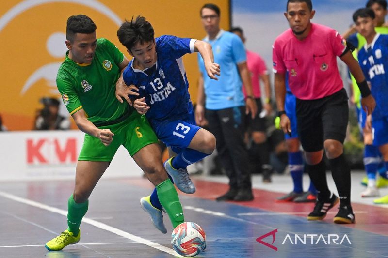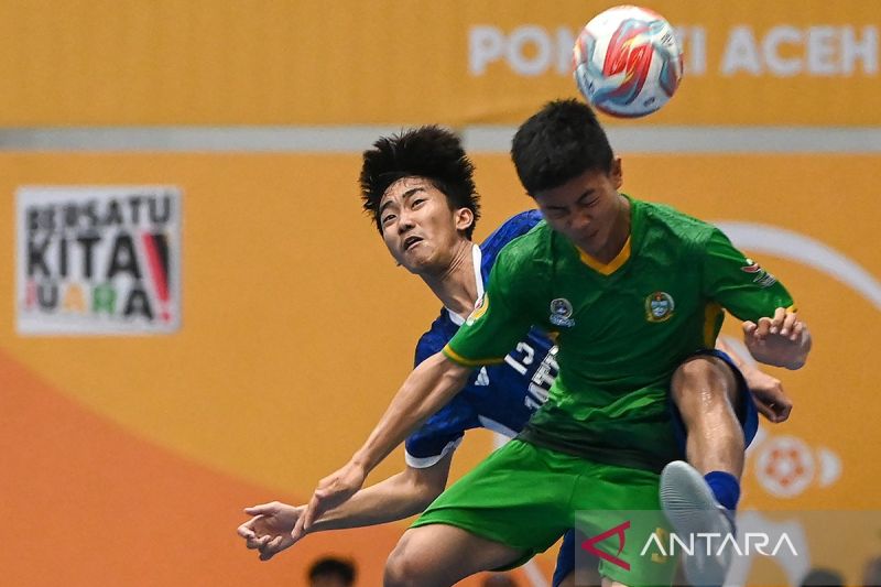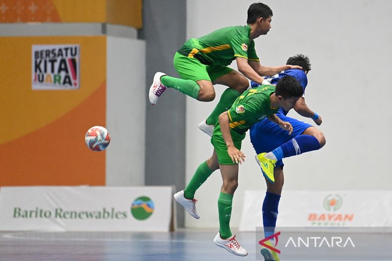 Atlet futsal putra Sumatera Utara Chandra Filaman (kanan) berusaha melewati atlet futsal putra Jawa Timur Rio Bintang (kiri) dalam pertandingan fase grup futsal putra PON XXI Aceh-Sumut di Arena Futsal Dinas Pemuda dan Olahraga Sumatera Utara (Disporasu), Deli Serdang, Sumatera Utara, Rabu (4/9/2024). Tim futsal putra Jawa Timur berhasil mengalahkan Sumatera Utara dengan skor 2-1. ANTARA FOTO/Fauzan/Spt.