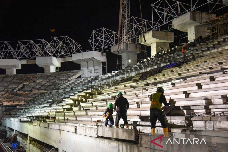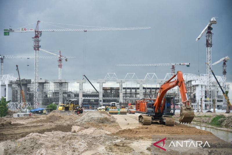 Pekerja menyelesaikan pembangunan Stadion Utama Sumatera Utara yang akan digunakan untuk Pekan Olahraga Nasional (PON) XXI Aceh-Sumut di Batang Kuis, Deli Serdang, Sumatera Utara, Rabu (7/8/2024). Progres pembangunan Stadion Utama Sumut yang akan digunakan untuk penutupan PON XXI Aceh-Sumut 2024 tersebut telah mencapai 81 persen dan ditargetkan rampung pada akhir Agustus 2024. ANTARA FOTO/Fransisco Carolio/tom.