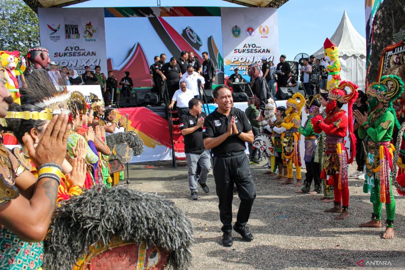 Menteri Pemuda dan Olahraga (Menpora) Zainudin Amali (tengah) bersama pejabat lainnya memukul drum saat peluncuran PON XXI Aceh-Sumut 2024 di Lapangan Astaka Pancing, Kota Medan, Sumatera Utara, Minggu (29/1/2023). Peluncuran logo, maskot Matra (Harimau Sumatera), dan "tagline" Bersatu Kita Juara untuk PON XXI Aceh-Sumut 2024 tersebut menjadi tanda dimulainya titik awal pelaksanaan agenda olahraga empat tahunan itu. ANTARA FOTO/Yudi/Lmo/hp.