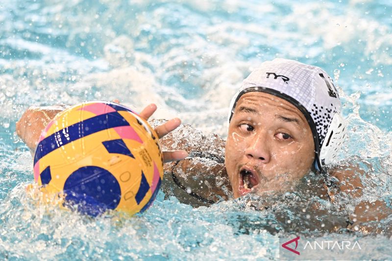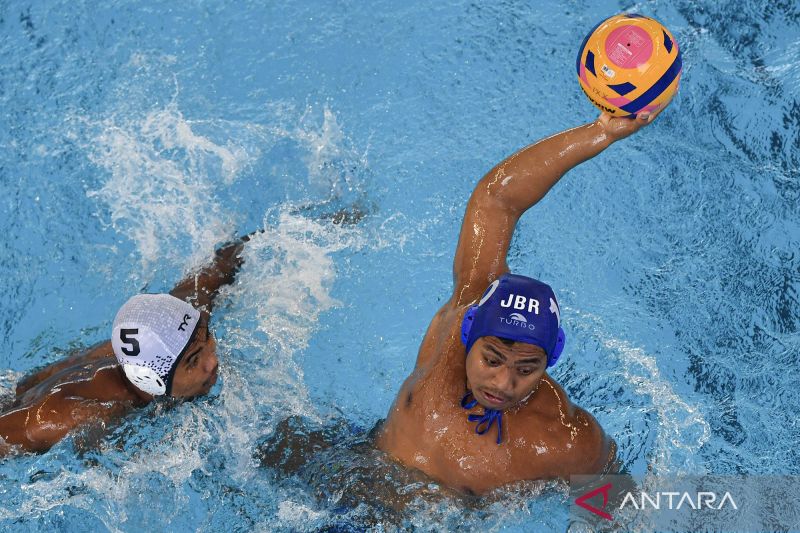 Atlet polo air Jambi Panji Putra berusaha membawa bola ke arah tim polo air Jawa Barat pada PON XXI Aceh-Sumut di Kolam Renang Selayang Dispora Sumatera Utara, Medan, Kamis (5/9/2024). Tim polo Jawa Barat menang dengan skor 18-13 atas Jambi. ANTARA FOTO/Nova Wahyudi/wpa.