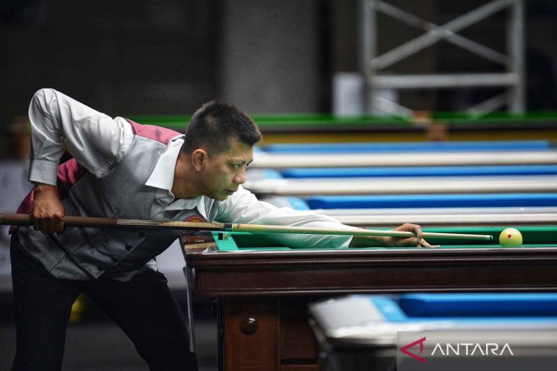 Pemain biliar DKI Jakarta Rudi H membidik bola pada final biliar carom 1 cushion single PON XXI Aceh-Sumut di Pardede Hall, Medan, Sumatera Utara.