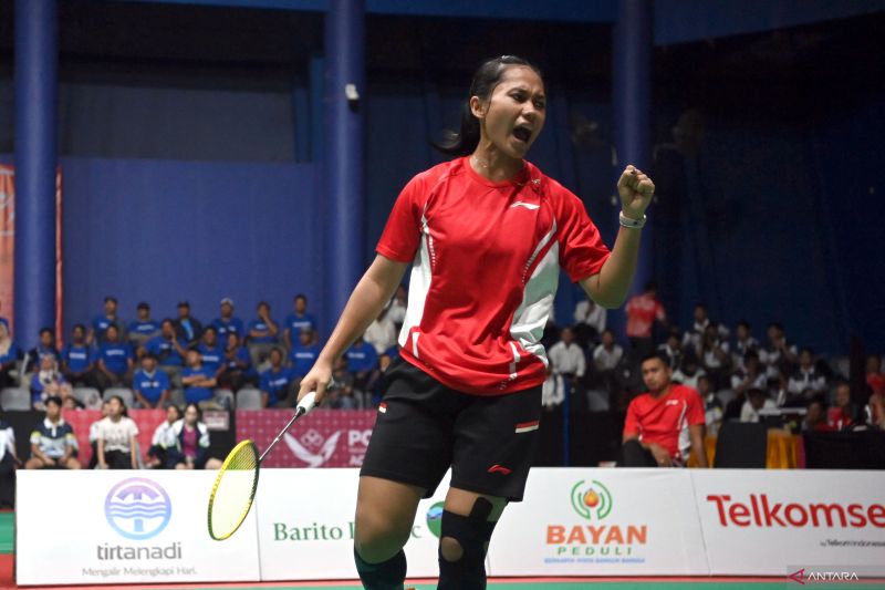 Pebulu tangkis Jawa Tengah Sausan Dwi Ramadhani (kedua kiri) melakukan selebrasi bersama rekan setimnya setelah mengalahkan pebulu tangkis Jawa Barat Kanaya Anisya Putri pada final bulu tangkis beregu putri PON XXI Aceh-Sumut 2024 di Gedung PBSI, Dinas Pemuda dan Olahraga Sumatera Utara (Disporasu), Medan, Sumatera Utara, Kamis (12/9/2024). Jawa Tengah meraih medali emas setelah menang atas Jawa Barat dengan skor 3-0. ANTARA FOTO/Yulius Satria Wijaya/nz.