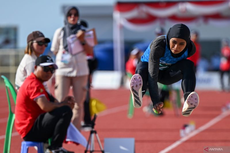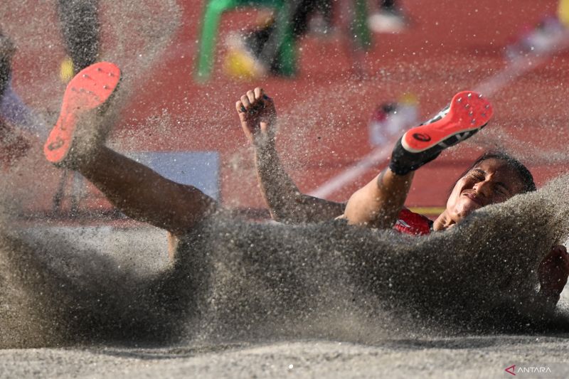 Atlet lompat jauh Bali Maria Londa melakukan lompatan pada final lompat jauh putri PON XXI Aceh-Sumut 2024 di Stadion Madya Atletik Sumut Sport Center, Deli Serdang, Sumatera Utara, Kamis (12/9/2024). Medali emas lompat jauh putri diraih Maria Londa dengan lompatan sejauh 6,44 meter, medali perak diraih atlet NTB Rohani dengan lompatan sejauh 6,14 meter, dan medali perunggu diraih atlet Papua Vinsensia Amjara dengan lompatan sejauh 6,06 meter. ANTARA FOTO/Fauzan/rwa.