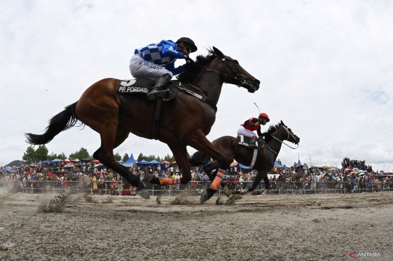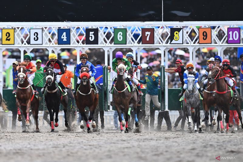 Sejumlah joki beradu cepat dalam perlombaan pacuan kuda kelas C-1.600 M PON XXI Aceh-Sumut 2024 di Arena Pacuan Kuda Belang Bebangka, Kabupaten Aceh Tengah, Aceh, Kamis (12/9/2024). Joki DKI Jakarta Ezra Tamunu dengan kudanya Galardo meraih medali emas pada kelas tersebut dengan catatan waktu satu menit 49,27 detik dana joki Jawa Timur Brahmantio FB Turangan meraih perak dengan waktu satu menit 49,90 detik serta joki Riau Rudi Rahmat meraih perunggu dengan waktu satu menit 52,26 detik. ANTARA FOTO/Arnas Padda/aww.