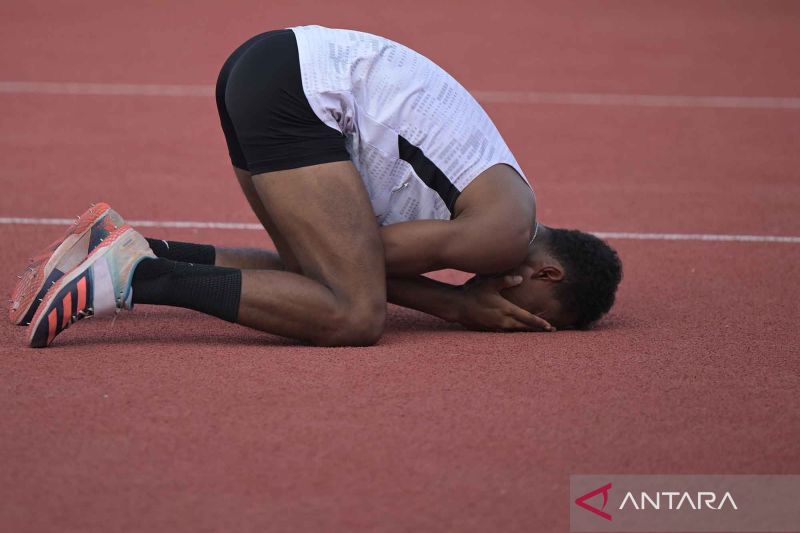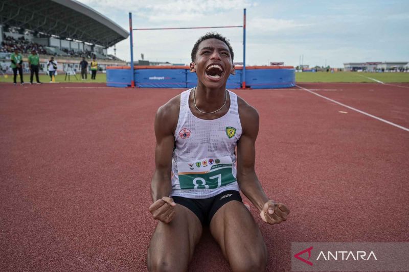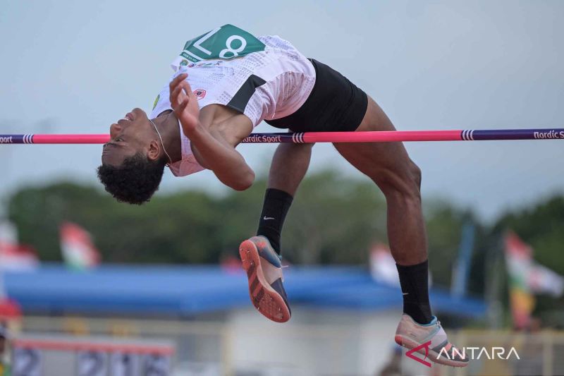 Atlet lompat tinggi DKI Jakarta Rafael melakukan lompatan pada final lompat tinggi putra PON XXI Aceh-Sumut 2024 di Stadion Madya Atletik Sumut Sport Center, Deli Serdang, Sumatera Utara, Jumat (13/9/2024). Medali emas diraih atlet DKI Jakarta Rafael sekaligus memecahkan rekor nasional dengan tinggi lompatan 2,16 meter, medali perak diraih atlet DKI Jakarta M Hariadi dengan tinggi lomptan 2,08 meter, dan medali perunggu diraih atlet Bali I Made Gede dengan tinggi lomptan 2,04 meter. ANTARA FOTO/Fauzan/rwa.