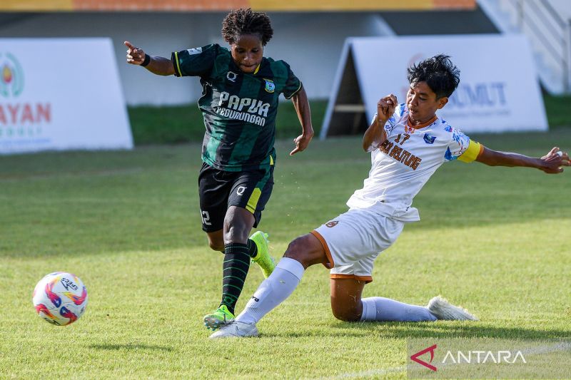 Pesepak bola Papua Pegunungan Regina Wonda (tengah) menggiring bola dibayangi pesepak bola Bangka Belitung Nadila (kiri) dan Amriza Destianty (kedua kiri) pada pertandingan perebutan tempat ketiga sepak bola putri PON XXI Aceh-Sumut di Stadion Mini Pancing, Deli Serdang, Sumatera Utara, Sabtu (14/9/2024). Papua Pegunungan menang atas Bangka Belitung dengan skor 1-0. ANTARA FOTO/Jessica Wuysang/agr