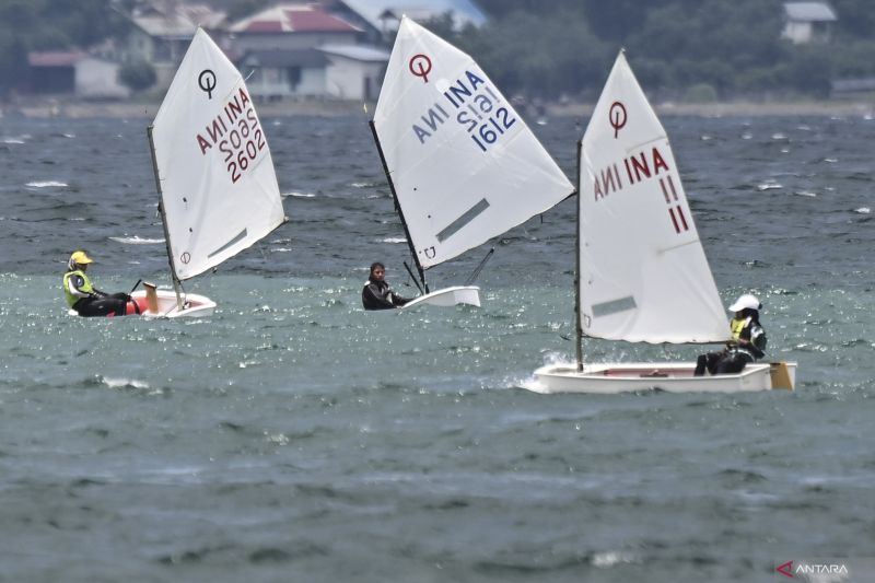 Sejumlah atlet layar beradu kecepatan pada nomor Internasional 470 Campuran PON XXI Aceh-Sumut 2024 di perairan laut Gampong Jawa, Banda, Aceh, Aceh, Minggu (15/9/2024). Sebanyak 52 atlet putri dari 14 kontingen berlaga dalam delapan nomor yakni, Optimist, ILCA 4, ILCA 6, Techno 293, Techno 293 plus, IQ Foil, Echo, dan Internasional 470 campuran. ANTARA FOTO/Aprillio Akbar/aww.