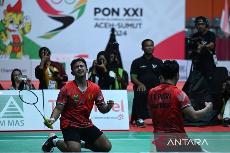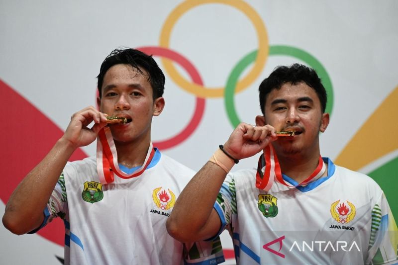Pebulu tangkis ganda putra Jawa Barat M Gibran Arfian (kanan) dan Galuh Dwi Putra (kiri) berpose dengan medali emasnya usai upacara penghargaan pemenang final bulu tangkis ganda putra PON XXI Aceh-Sumut di Gedung PBSI Dinas Pemuda dan Olahraga Sumatera Utara (Disporasu), Deli Serdang, Sumatera Utara, Kamis(19/9/2024). M Gibran Arfian/Galuh Dwi Putra meraih medali emas usai mengalahkan ganda putra Jawa Timur Gilang Krisandi Toyo Pramana/Kleopas Binar Putra Prakoso dengan skor 21-19, 21-13 . ANTARA FOTO/Fransisco Carolio/tom.