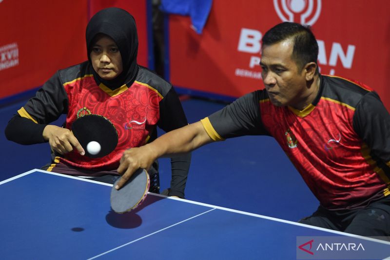 Petenis meja ganda campuran Jawa Tengah Andri Budi (atas) dan Agustiningsih (bawah) mengembalika bola ke arah lawannya petenis meja DI Yogyakarta Riyan Hadi dan Eva pada penyisihan tenis meja kursi roda T10 Peparnas XVII Solo 2024 di GOR Bung Karno, Sukoharjo, Jawa Tengah, Senin (7/10/2024). Andri Budi dan Agustiningsih menang dengan skor 3-2. ANTARA FOTO/Aloysius Jarot Nugroho/aww.