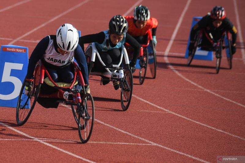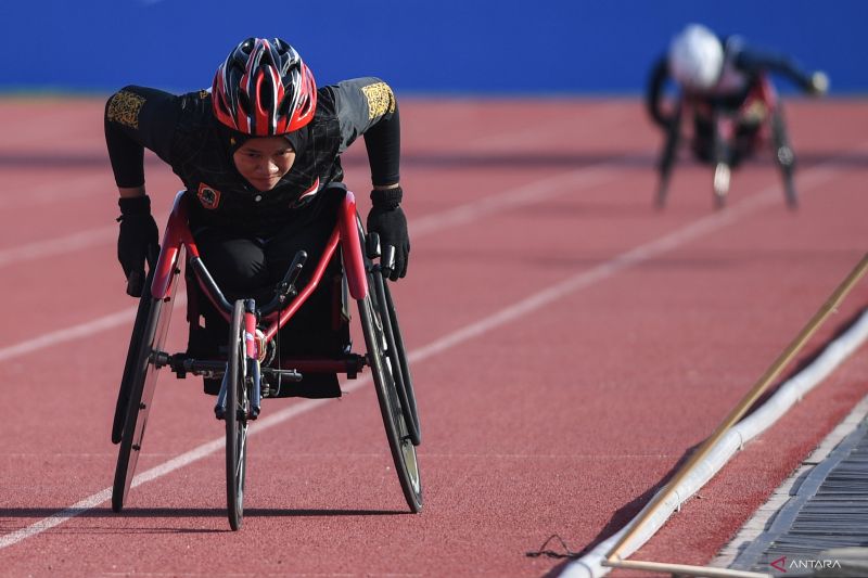 Atlet balap kursi roda Kalimantan Selatan Nur Hidayah memacu kecepatan pada final 800 meter klasifikasi T52-54 putri Peparnas XVII Solo 2024 di Stadion Sriwedari, Solo, Jawa Tengah, Kamis (10/10/2024). Nur Hidayah meraih medali emas setelah finis pada posisi pertama dengan catatan waktu 3 menit 3,38 detik, disusul atlet balap kursi roda Jawa Barat Rina Nuryani pada posisi kedua dengan catatan waktu 3 menit 15,97 detik dan atlet balap kursi roda Kalimantan Timur Rima Lupita Sari pada posisi ketiga dengan catatan waktu 3 menit 38,89 detik. ANTARAFOTO/Maulana Surya/tom.