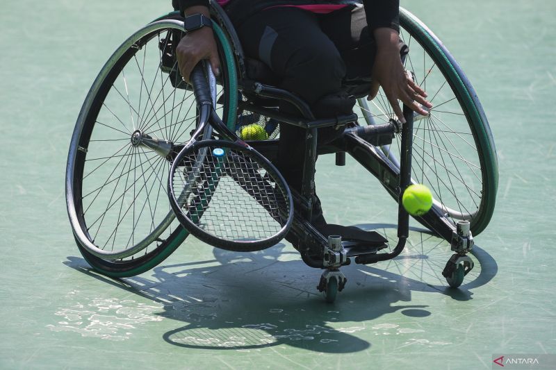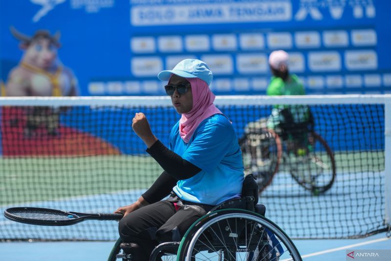 Petenis tunggal putri Papua Siti Hana Komala Sari bersiap melakukan servis ke arah lawannya petenis tunggal putri DI Yogyakarta Ndaru Patma Putri pada final tunggal putri tenis kursi roda Peparnas XVII Solo 2024 di lapangan tenis Manahan, Solo, Jawa Tengah, Jumat (11/10/2024). Siti Hana Komala Sari meraih medali emas setelah mengkalahkan Ndaru Patma Putri dengan skor 2-0. ANTARA FOTO/Maulana Surya/wpa.