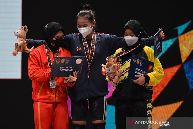 Lifter putri Jawa Barat Windy Cantika mengangkat beban pada kelas 49 kg PON Papua di Auditorium Universitas Cenderawasih, Kota Jayapura, Papua, Rabu (6/10/2021). Lifter putri Jawa Barat Windy Cantika berhasil meraih medali emas dengan total angkatan 192 kg sementara medali perak diraih lifter Jawa Tengah Siti Nafisatul dengan total angkatan 170 kg dan medali perunggu diraih lifter Kalimantan Selatan Riska Nur Amanda dengan 167 kg. ANTARA FOTO/Fauzan/pras.