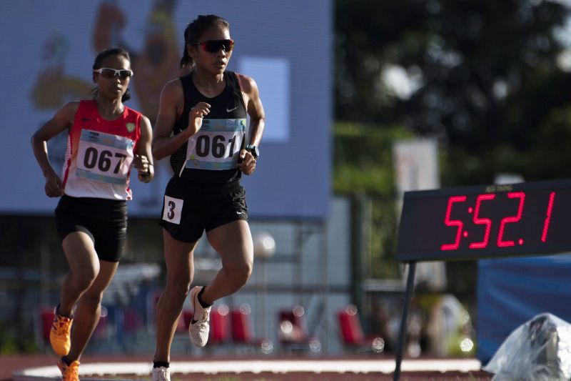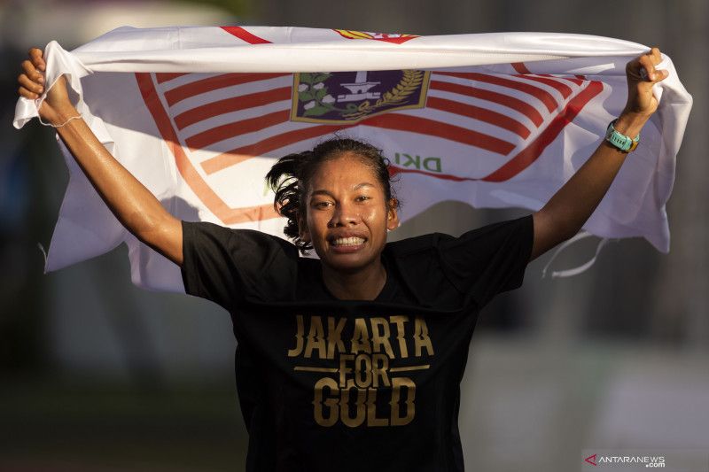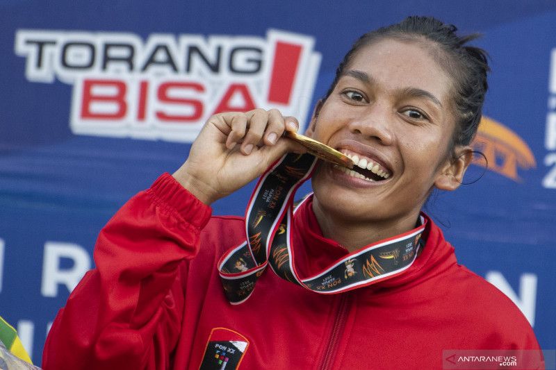 Pelari DKI Jakarta Odekta Elvina Naibaho menggigit medalinya usai memenangi pertandingan final nomor lari 10.000 meter putri PON Papua di Stadion Atletik Mimika Sport Center, Kabupaten Mimika, Papua, Kamis (7/10/2021). Odekta berhasil meraih medali emas, sementara pelari Kalimantan Timur Irma Handayani mendapat medali perak dan Tryaningsih dari DKI Jakarta memperoleh medali perunggu. ANTARA FOTO/Aditya Pradana Putra/tom.