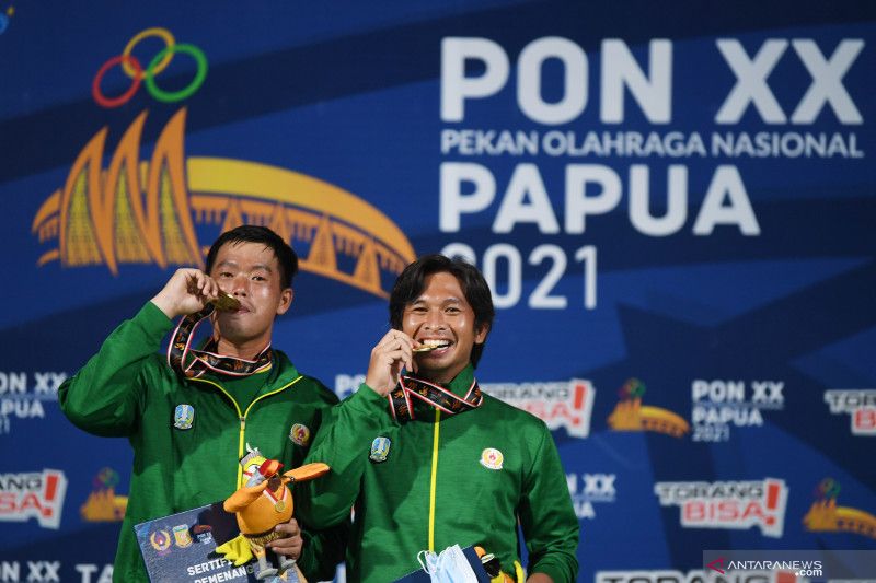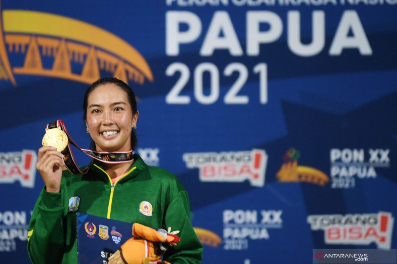 Tim tenis Jawa Timur berpose menunjukkan angka tujuh dengan medali yang mereka raih dari cabang tenis PON Papua di Jayapura, Papua, Kamis (7/10/2021). Jawa Timur menyapu bersih tujuh emas dalam cabang tenis. ANTARA FOTO/Akbar Nugroho Gumay/tom.