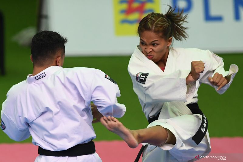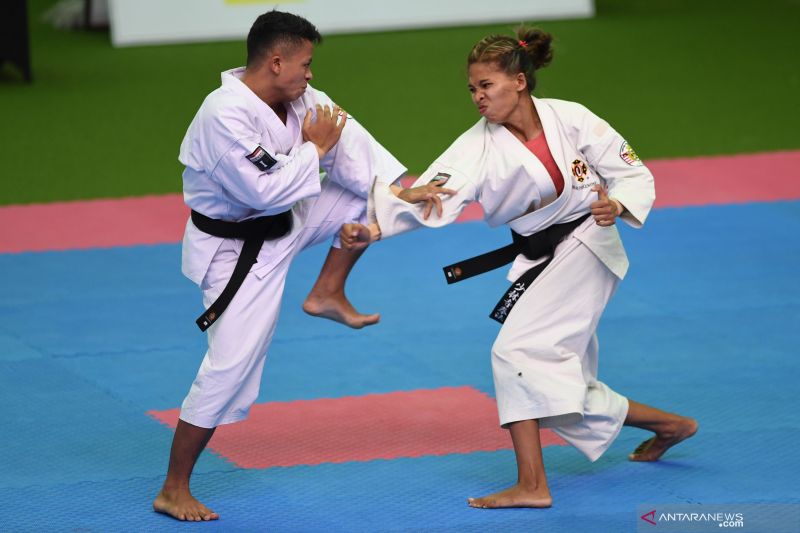 Pasangan atlet shorinji kempo Nusa Tenggara Timur Dionisius H Ramli (kiri) dan Aldiani Astrid Helena Deny (kanan) memperagakan aksi bela diri pada final shorinji kempo embu berpasangan campuran yudansha PON Papua di GOR STT Gidi, Sentani, Kabupaten Jayapura, Papua, Sabtu (9/10/2021). Pasangan atlet Jawa Barat Hagies Mugara dan Adinda Putri Sofyan berhasil meraih medali emas disusul pasangan atlet Kalimantan Timur Erick Syahputra dan Marlina Sari meraih medali perak dan pasangan atlet Nusa Tenggara Timur Dionisius H Ramli dan Aldiani Astrid Helena Deny mendapat medali perunggu. ANTARA FOTO/Zabur Karuru/pras.