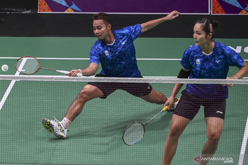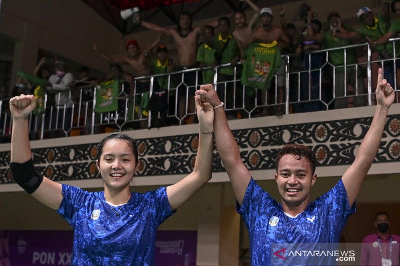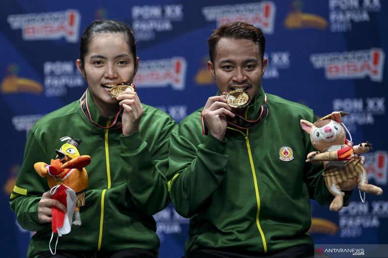 Pebulu tangkis ganda campuran Jawa Timur Rehan Naufal Kusharjanto dan Marheilla Gischa Islami berpose dengan medali emasnya usai memenangkan pertandingan final Bulu Tangkis Ganda Campuran PON Papua di GOR Waringin Kotaraja, Kota Jayapura, Papua, Rabu (13/10/2021). Rehan Naufal Kusharjanto dan Marheilla Gischa Islami menang atas lawannya pebulu tangkis ganda campuran Jawa Tengah Bagas Maulana dan Indah Cahya Sari Jamil dengan skor 21-19, 19-21, 15-6. ANTARA FOTO/Nova Wahyudi/hp.