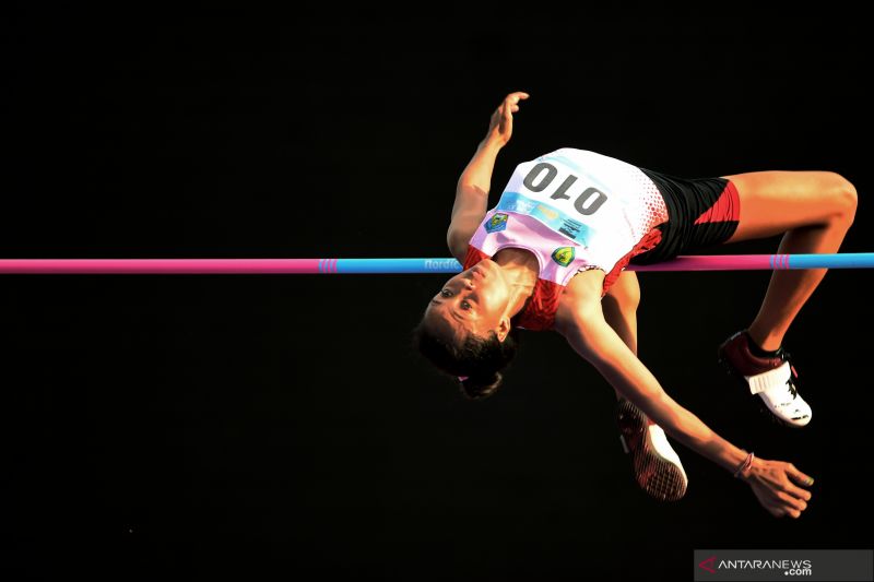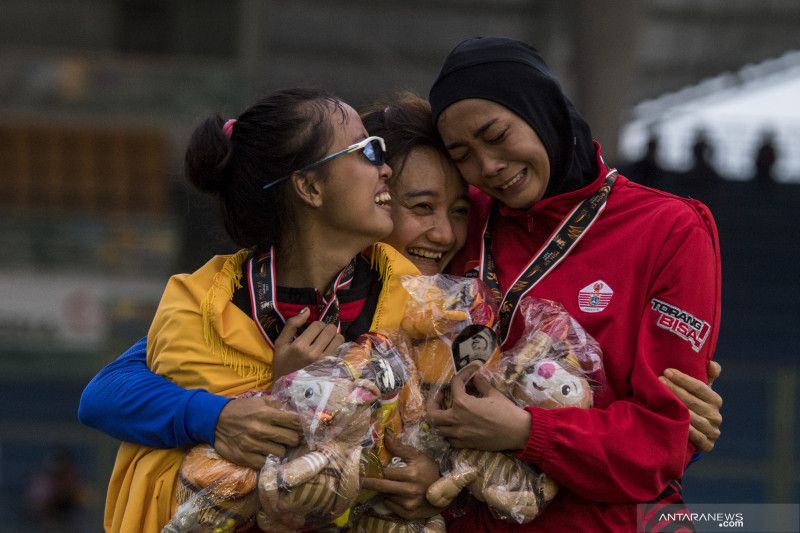 Atlet putri Bali Ni Made Eppi (kiri) bersama atlet putri Jawa Barat Ika Puspa Dewi (tengah) dan atlet putri DKI Jakarta Nadia Anggraini (kanan) berpelukan usai pengalungan medali Lompat Tinggi Putri PON Papua di Stadion Atletik Mimika Sport Centre, Kabupaten Mimika, Papua, Rabu (13/10/2021). Ni Made berhasil meraih medali emas, sementara atlet Jawa Barat Ika Puspa Dewi meraih medali perak dan atlet DKI Jakarta Nadia Anggraini meraih medali perunggu. ANTARA FOTO/Novrian Arbi/YU