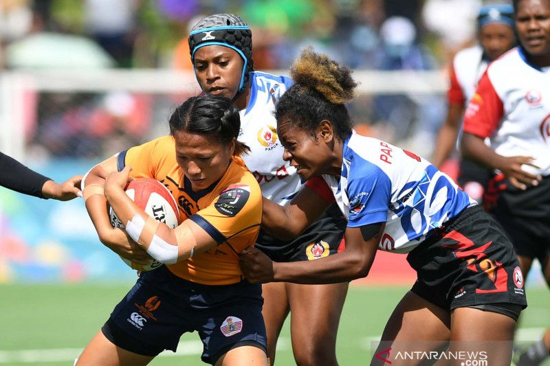 Atlet rugby putri DKI Jakarta Pipit Ayu Lestari (kanan) melempar bola ke arah rekannya yang dihadang atlet rugby putri Papua Inha Yahmin (tengah bawah) saat bertanding pada final Rugby 7s Putri PON Papua di Lapangan Rugby AURI, Kabupaten Jayapura, Papua, Rabu (13/10/2021). Pada pertandingan tersebut tim rugby putri DKI Jakarta menang atas Papua dengan skor 12-10, dan berhasil merebut medali emas sedangkan Papua perak. ANTARA FOTO/Mohammad Ayudha/hp.