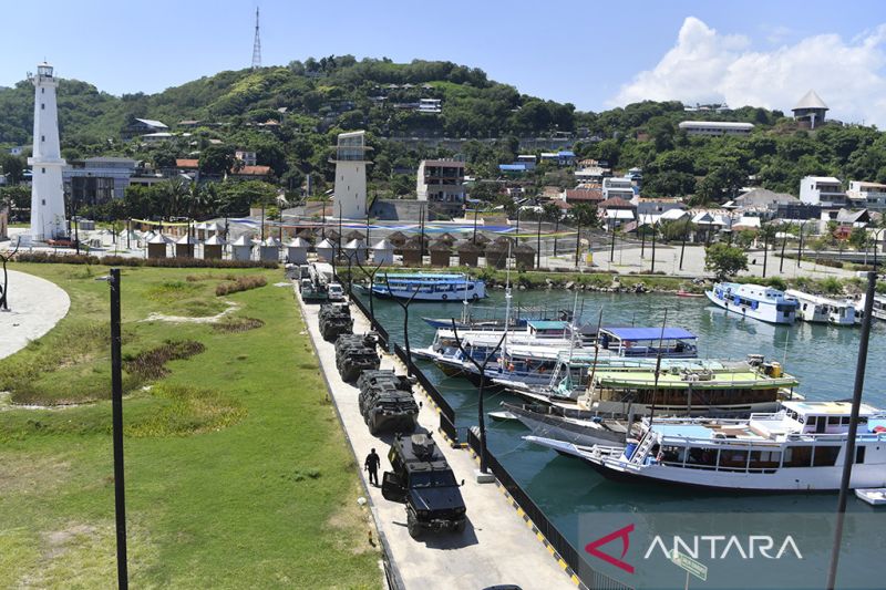Sejumlah kendaraan taktis bersiaga saat simulasi di Labuan Bajo, Manggarai Barat, NTT, Minggu (7/5/2023). Simulasi tersebut dalam rangka pengamanan kunjungan delegasi ke KM Sinabung yang dijadikan akomodasi terapung selama perhelatan KTT ASEAN di Labuan Bajo. ANTARA FOTO/Zabur Karuru/nym.
