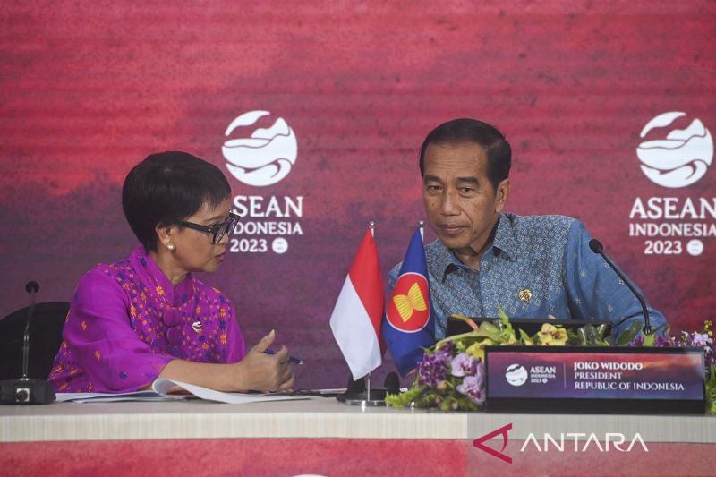 Presiden Indonesia Joko Widodo bersiap meninggalkan ruangan usai memberikan keterangan pers terkait hasil pertemuan Konferensi Tingkat Tinggi (KTT) ke-42 ASEAN, di Labuan Bajo, Manggarai Barat, NTT, Kamis (11/5/2023). Dalam keterangan persnya, Presiden Joko Widodo mengatakan para pemimpin ASEAN menilai kasus Myanmar merupakan pencederaan terhadap nilai-nilai kemanusiaan sehingga tidak bisa ditoleransi serta Asean sepakat untuk membangun ekosistem mobil listrik dan menjadi bagian penting dari rantai pasok dunia sehingga hilirisasi industri menjadi kunci. POOL/ANTARA FOTO/Rivan Awal Lingga/aww.