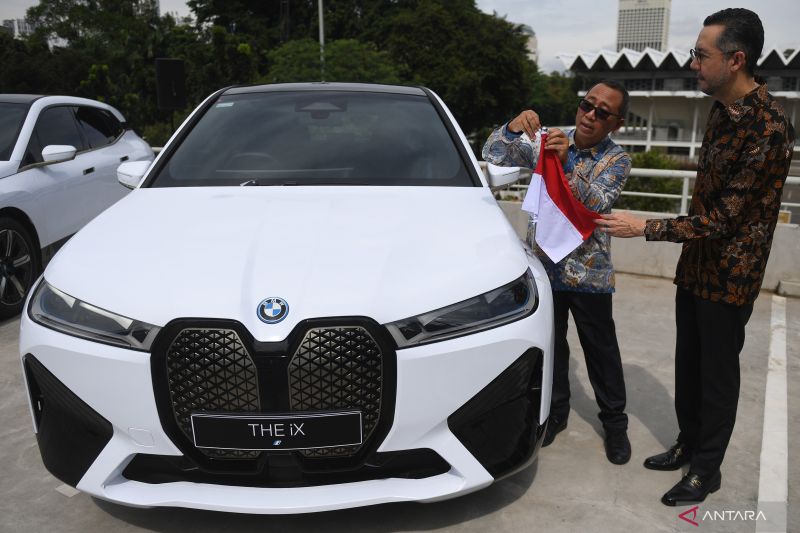Sekretaris Kementerian Sekretariat Negara (Kemensetneg) Setya Utama (kanan) berbincang dengan President Director of BMW Group Indonesia Ramesh Divyanathan (kiri) usai acara serah terima mobil resmi KTT ASEAN BMW iX di Jakarta, Kamis (13/4/2023). BMW menyerahkan 13 kendaraan listrik premium BMW iX kepada Kemensetneg untuk digunakan oleh presiden maupun perdana menteri negara peserta KTT ASEAN ke-42 di Labuan Bajo, NTT, 9-11 Mei 2023. ANTARA FOTO/Akbar Nugroho Gumay/tom.