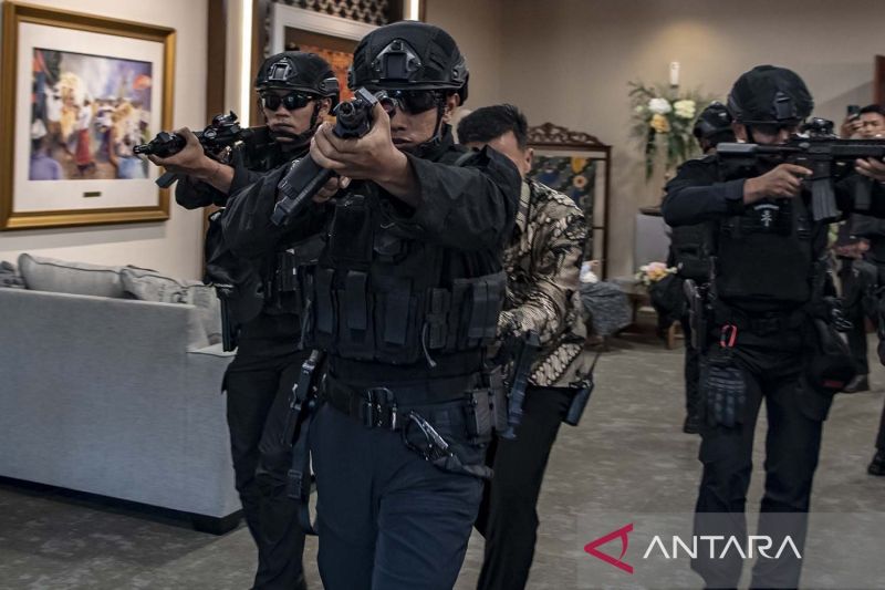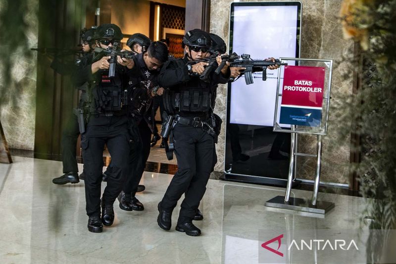 Anggota Pasukan Pengamanan Presiden melakukan simulasi pengamanan kepala negara peserta Konferensi Tingkat Tinggi (KTT) ASEAN ke-43 di Bandara Internasional Soekarno Hatta, Tangerang, Banten, Senin (28/8/2023). Simulasi tersebut digelar untuk mengoptimalkan pengamanan saat KTT ke-43 ASEAN pada 5-7 September 2023 di Jakarta. ANTARA FOTO/Muhammad Adimaja/tom.