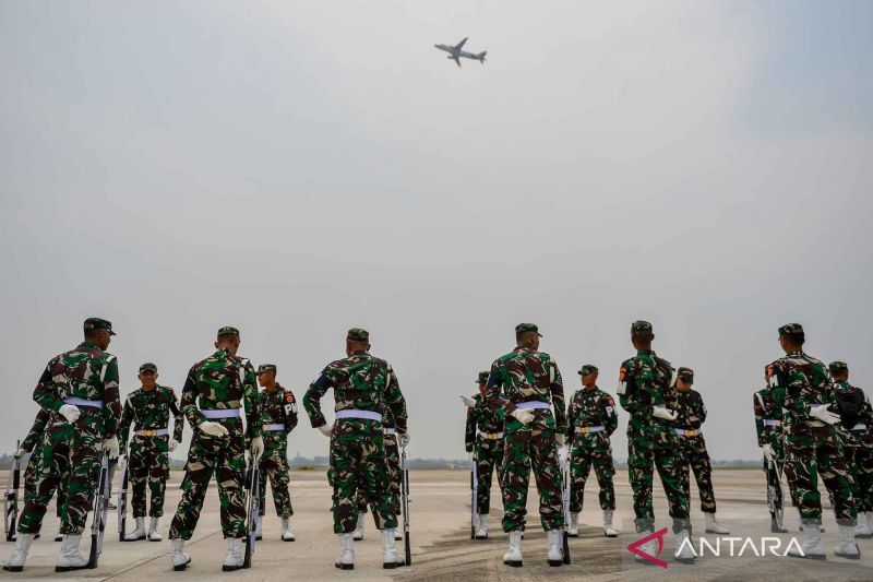 Anggota Pasukan Pengamanan Presiden melakukan simulasi penyambutan kepala negara dan rombongan delegasi Konferensi Tingkat Tinggi (KTT) ASEAN ke-43 setibanya di Bandara Internasional Soekarno Hatta, Tangerang, Banten, Kamis, (31/8/2023). Simulasi tersebut dilakukan sebagai kesiapan penyambutan tamu negara VVIP yang menghadiri KTT ASEAN ke-43 di Jakarta. ANTARA FOTO/Raisan Al Farisi/nym.