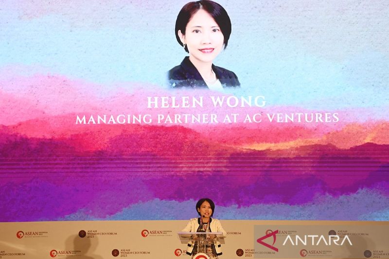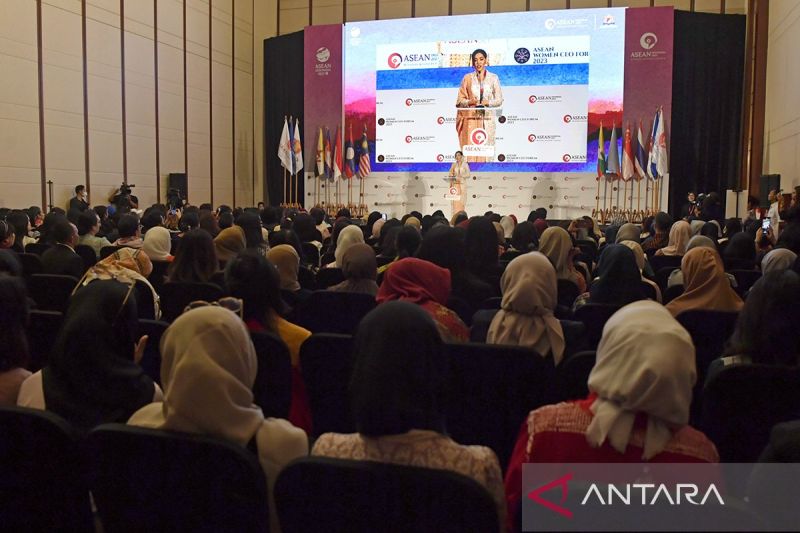 Putri Indonesia 2022 Laksmi De Neefe Suardana memberikan sambutan pada ASEAN Women CEO Forum di Jakarta, Sabtu (2/9/2023). ANTARA FOTO/Media Center KTT ASEAN 2023/Zabur Karuru/foc