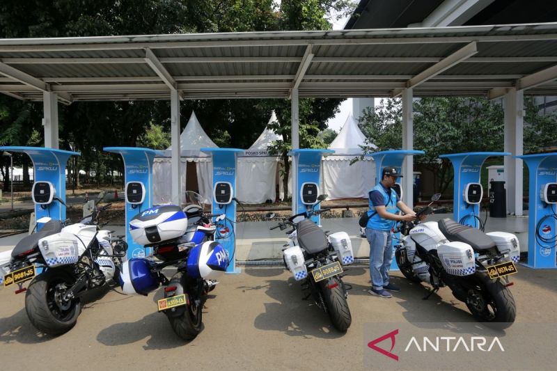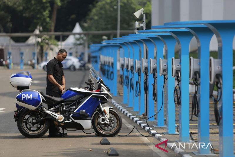 Petugas melakukan pengisian daya kendaraan listrik di Stasiun Pengisian Kendaraan Listrik Umum (SPKLU) kawasan Gelora Bung Karno Jakarta, Sabtu (2/9/2023). Jelang penyelenggaraan Konferensi Tingkat Tinggi (KTT) ke-43 ASEAN di Jakarta pada 5-7 September 2023, PLN akan menggunakan pasokan listrik berbasis energi baru terbarukan (EBT). ANTARA FOTO/Media Center KTT ASEAN 2023/Dwi Prasetya/tom.