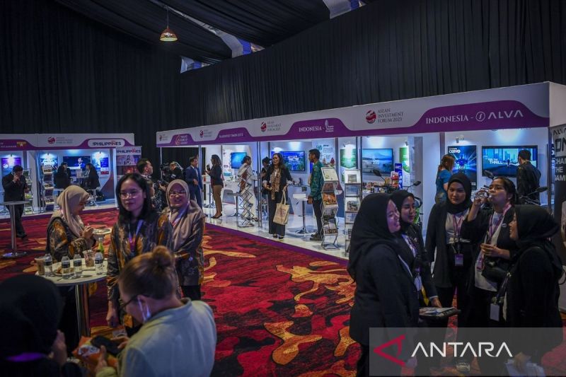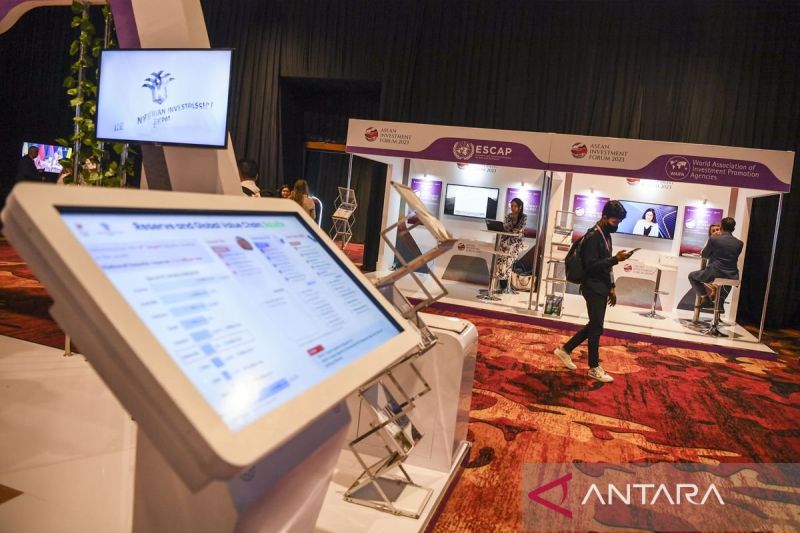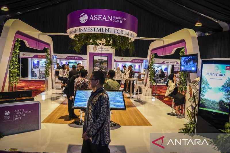 Pengunjung meninjau salah satu stan pada ASEAN Investment Forum di Hotel Sultan, Jakarta, Sabtu (2/9/2023). Pameran tersebut menampilkan keunggulan masing-masing negara anggota ASEAN yang bertujuan untuk menciptakan iklim investasi yang kondusif, berdaya saing, dan memperluas jejaring serta menarik para investor menanamkan modalnya. ANTARA FOTO/Media Center KTT ASEAN 2023/Galih Pradipta/tom.
