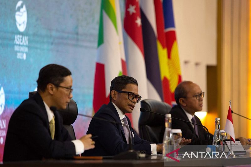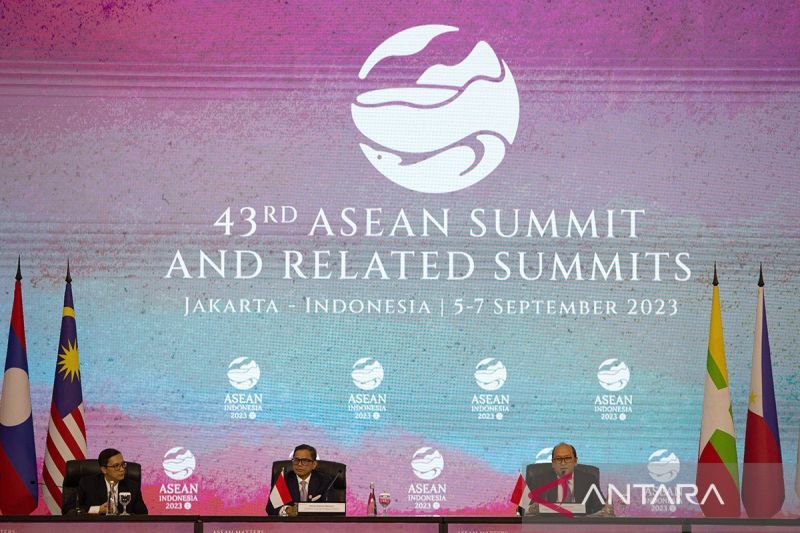 Presiden RI Joko Widodo bersama para kepala negara/pemerintahan negara ASEAN mendengarkan presentasi dari Dirut PT PLN (Persero) Darmawan Prasodjo (kanan) saat mengunjungi stan di sela-sela acara ASEAN-Indo-Pacific Forum (AIPF) di Hotel Mulia, Jakarta, Selasa (5/9/2023). ANTARA FOTO/Media Center KTT ASEAN 2023/Galih Pradipta/aww.