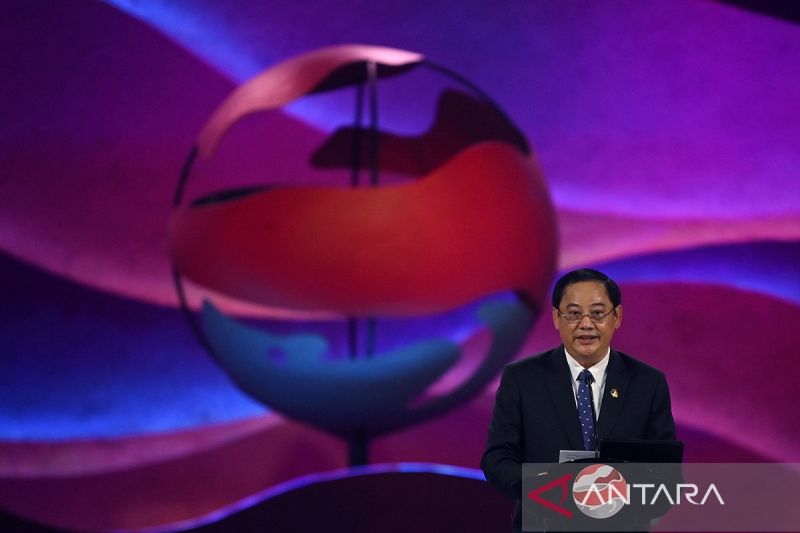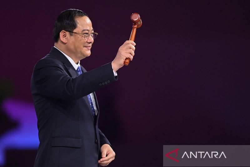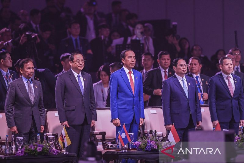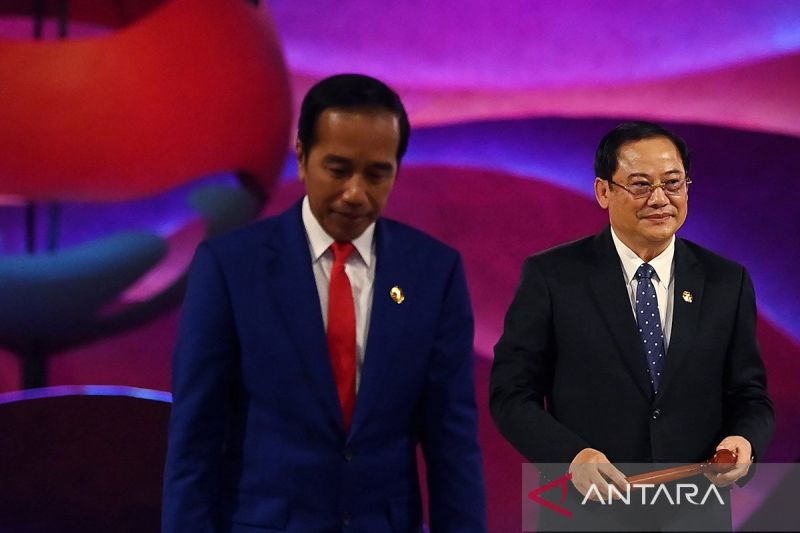 Presiden Joko Widodo (kiri) menyerahkan palu tanda keketuaan ASEAN kepada Perdana Menteri Laos Sonexay Siphandone saat penutupan KTT ke-43 ASEAN 2023 di Jakarta Convention Center (JCC), Senayan, Jakarta, Kamis (7/9/2023). ANTARA FOTO/Media Center KTT ASEAN 2023/Aditya Pradana Putra/Spt.