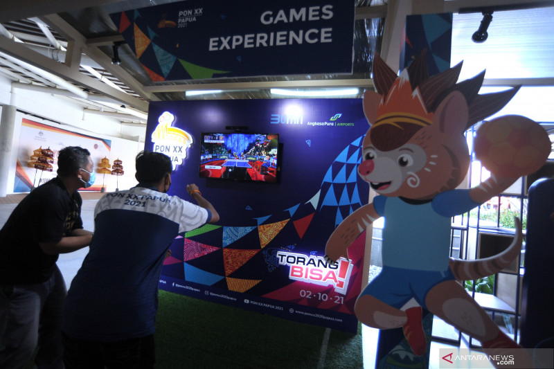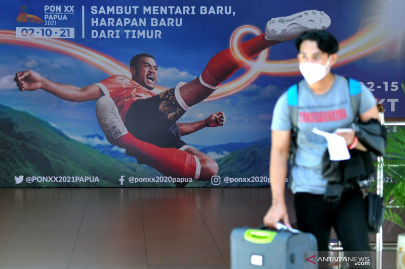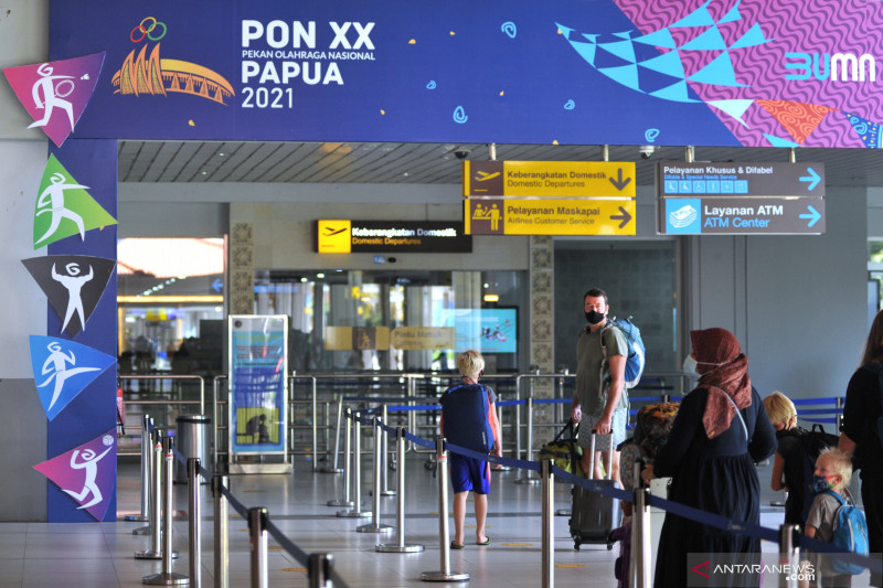 Pengguna jasa bandara melintas di dekat media promosi Pekan Olahraga Nasional (PON) XX Papua di Terminal Domestik Bandara Internasional I Gusti Ngurah Rai, Badung, Bali, Kamis (1/7/2021). Angkasa Pura 1 selaku pengelola Bandara Ngurah Rai mendukung pelaksanaan PON XX Papua 2021 yang akan diselenggarakan bulan Oktober mendatang dengan memasang sejumlah instalasi, media promosi serta area khusus ekshibisi untuk 'branding' dan promosi. ANTARA FOTO/Fikri Yusuf/hp.