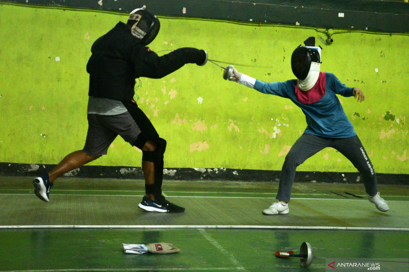 Atlet cabang olahraga anggar M Irfan Ibrahim (kiri) dan Arina Nur Andini (kanan) mengikuti latihan persiapan Pekan Olahraga Nasional (PON) di Gedung Olahraga Mattoangin, Makassar, Sulawesi Selatan, Senin (20/9/2021). Tim anggar Sulawesi Selatan mengikutkan empat atlet yang terdiri dua putra dan dua putri kelas floret dan degen pada PON Papua. ANTARA FOTO/Abriawan Abhe/aww.